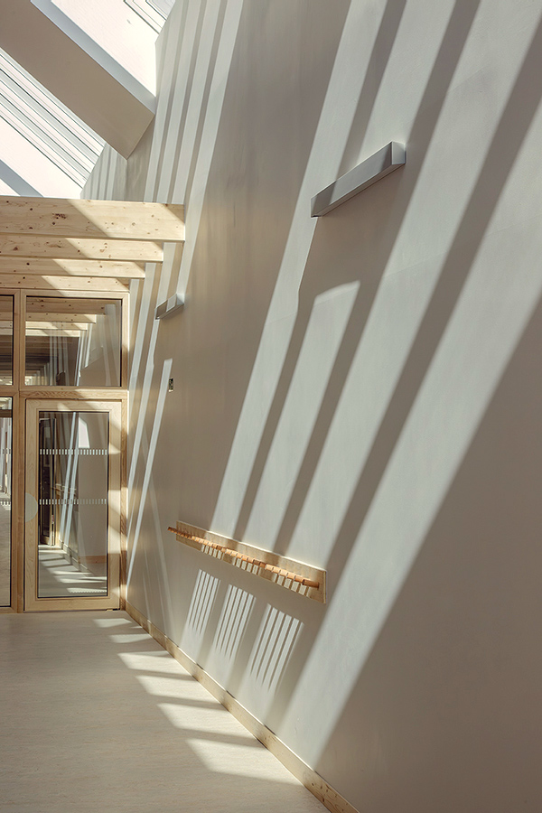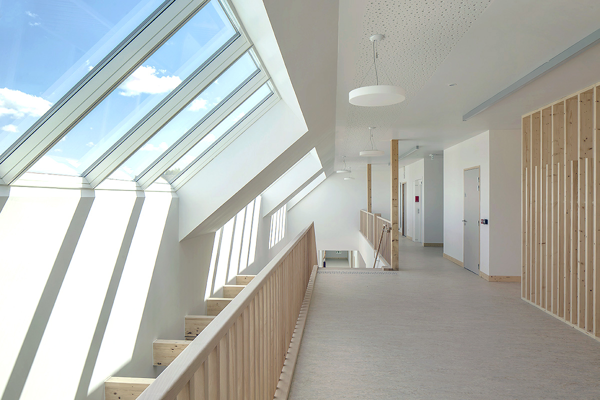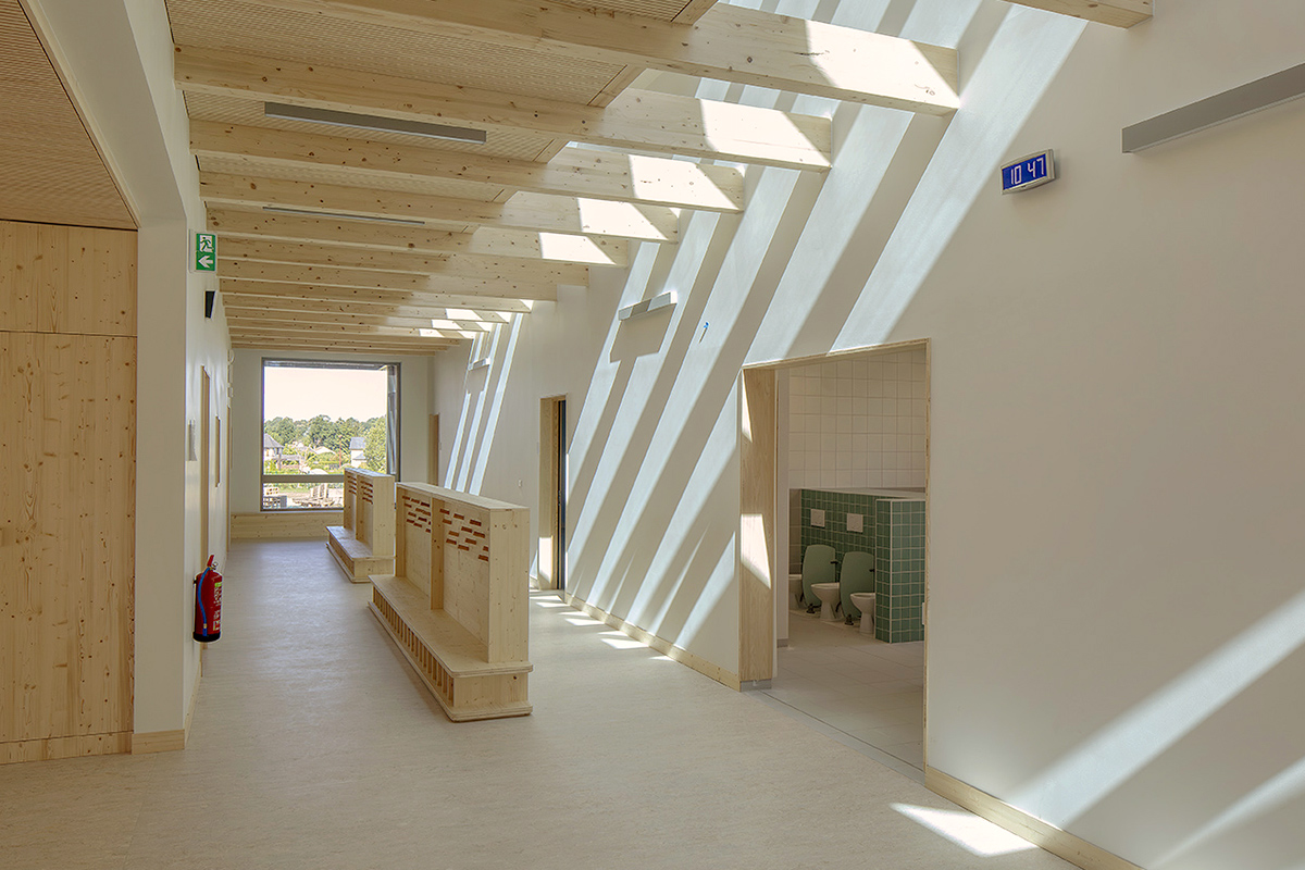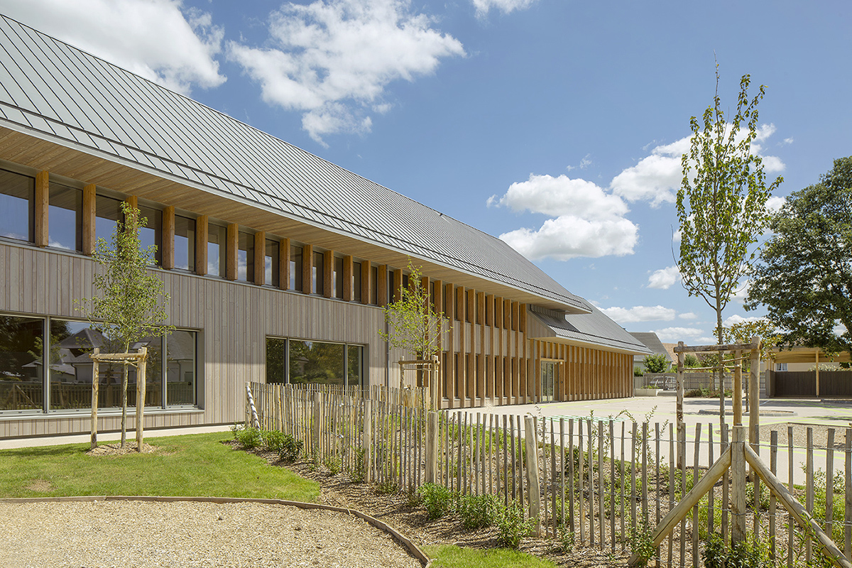 A partir de ce parvis, le groupe scolaire, nouvel équipement majeur du quartier, se développe sous la forme d’un long bâtiment qui s’étage sur 2 niveaux en se positionnant sur la parcelle selon un axe transversal est/ouest et perpendiculairement à la rue du sud. Cette implantation très rationnelle du projet sur le terrain a pour avantage d’orienter l’ensemble des salles de classes au sud et d’y aménager de larges espaces récréatifs et de grands espaces paysagers bien exposés. S’étageant progressivement d’un volume à simple rez-de-chaussée vers un bâtiment à R+1 en cœur de parcelle, le bâtiment de l’école présente sur rue un pignon d’un seul niveau. Traité dans une écriture architecturale traditionnelle avec toiture à double pente traitée en zinc prépatiné et façades traitées en bardage en bois, il s’intègre ainsi parfaitement à l’échelle de la rue en référence au bâti ancien local. Côté parvis au nord, adossé au bâtiment abritant les salles de classe, un volume mono-pente à simple RDC de faible profondeur se développe linéairement de part et d’autre des deux entrées de l’école, et abrite les fonctions d’accueil et d’administration des deux pôles. Cette disposition du bâti permet d’offrir une lecture franche et claire des espaces accessibles au public au nord et ceux dédiés aux enfants au sud.