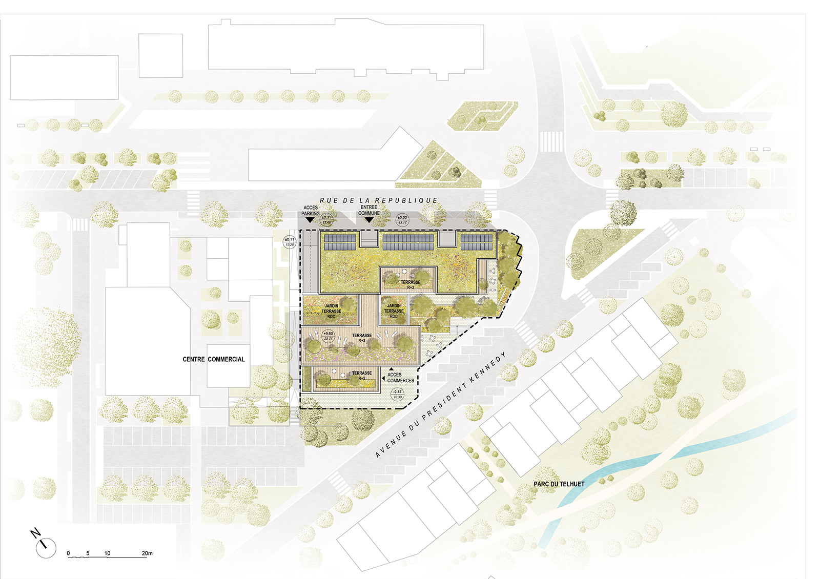 Conçu de façon unitaire, l’aménagement global de l’îlot répond à une cohérence architecturale et paysagère où les volumes et les fonctions dialoguent et se répondent dans un même vocabulaire de formes et de matériaux. Cette sectorisation des fonctions permet une fluidité de fonctionnement ainsi que des flux parfaitement différenciés entre les usagers et utilisateurs des différentes entités.
