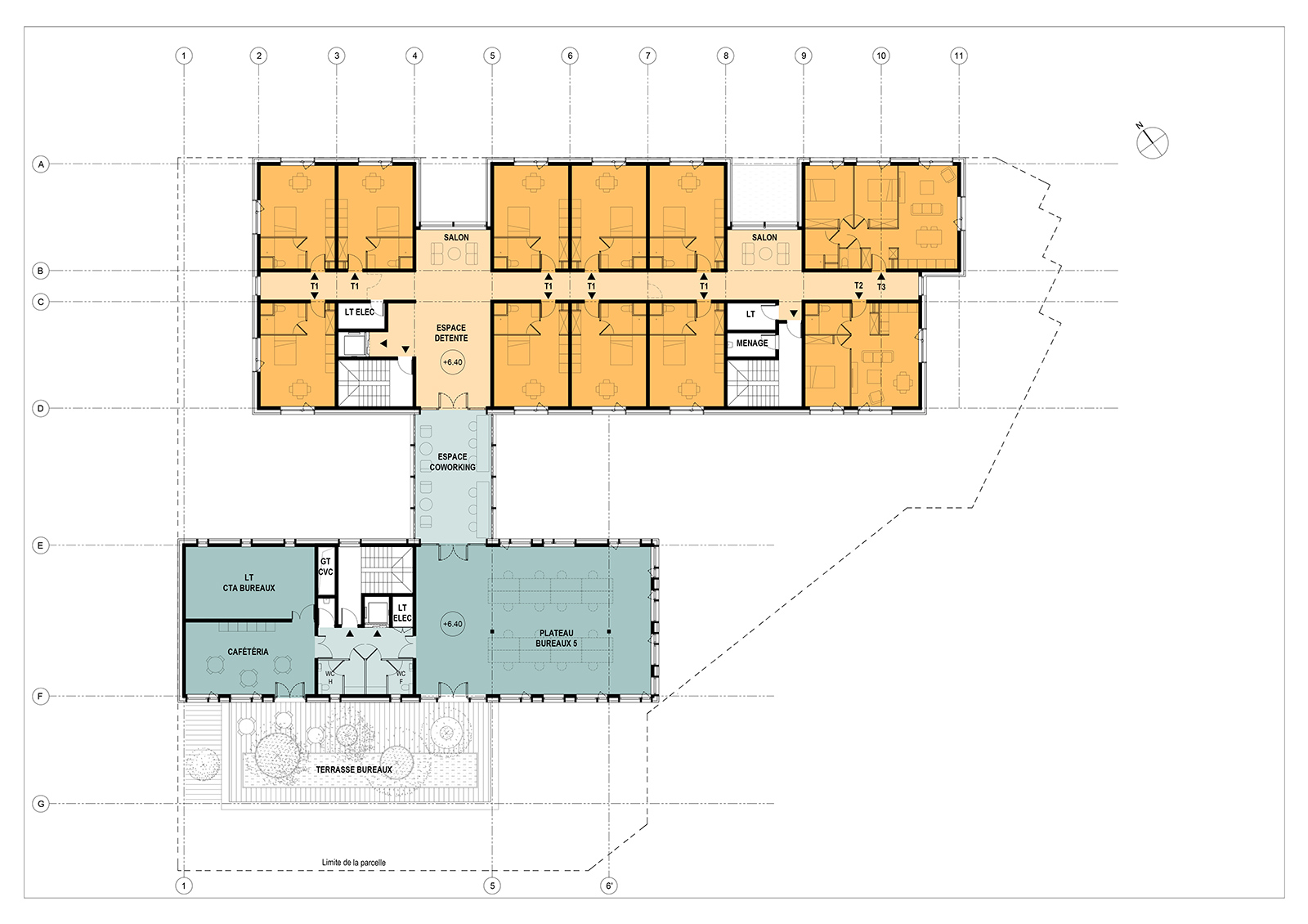 – les plateaux de bureaux en premier plan dans un volume plus compact,