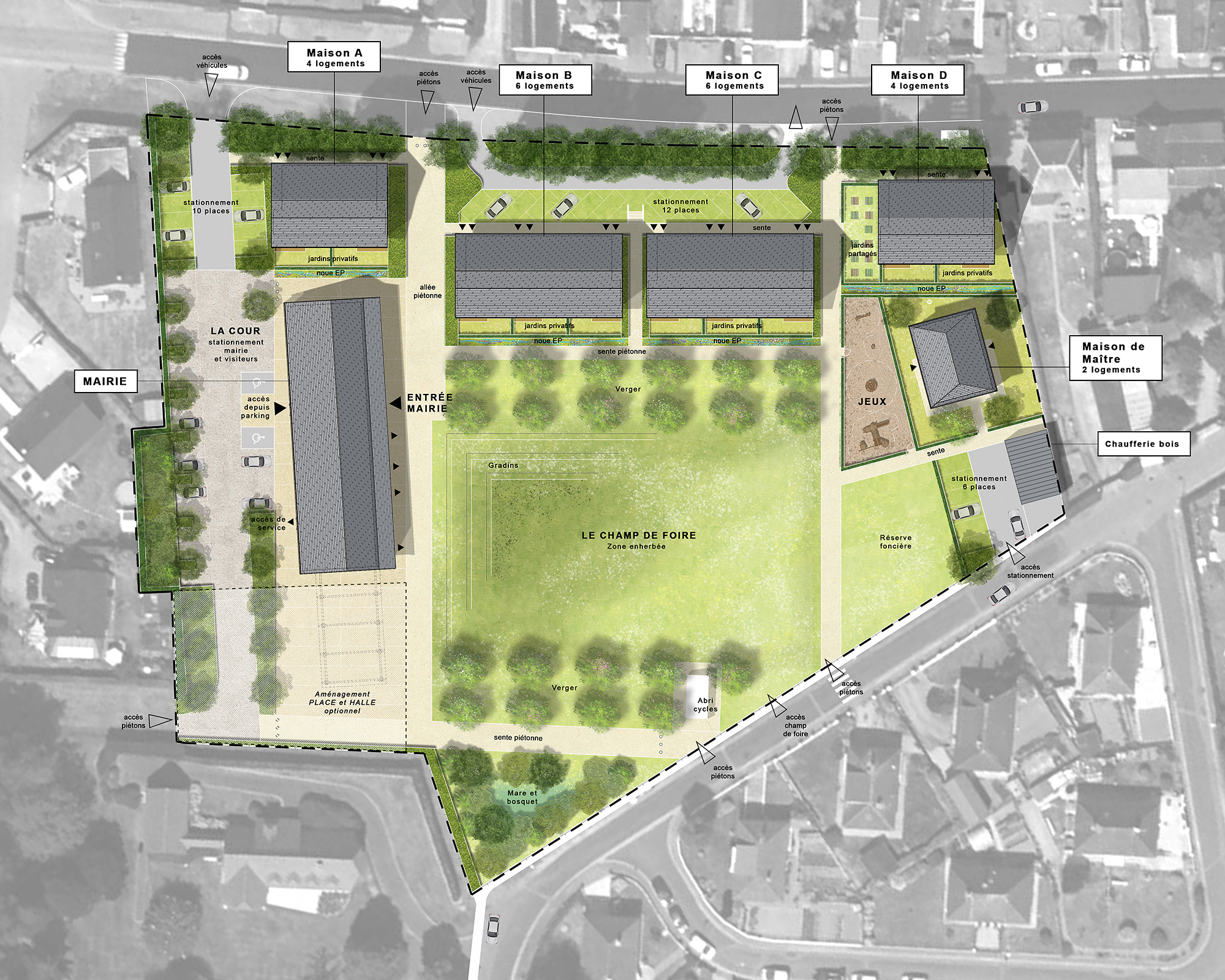 Résidence intergénérationnelle, maison de maître, mairie, salle d’activités, espaces publics et jardins partagés