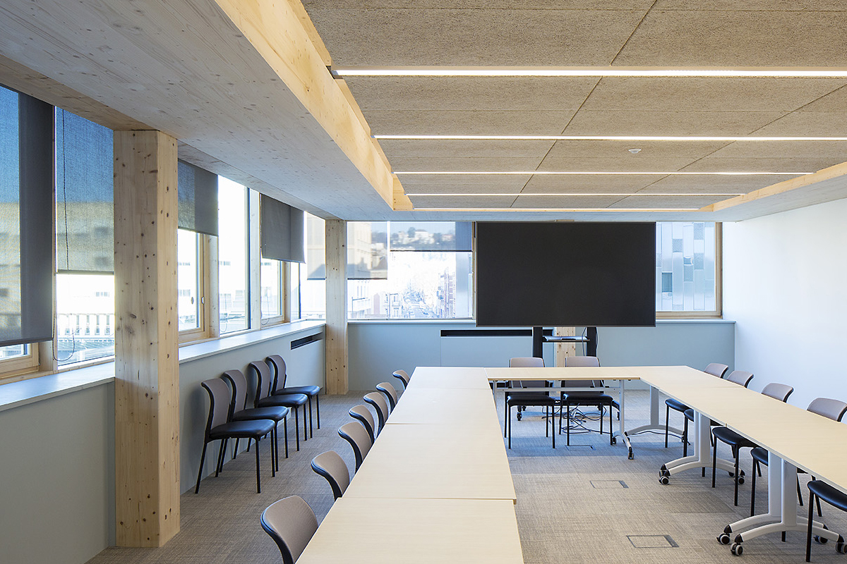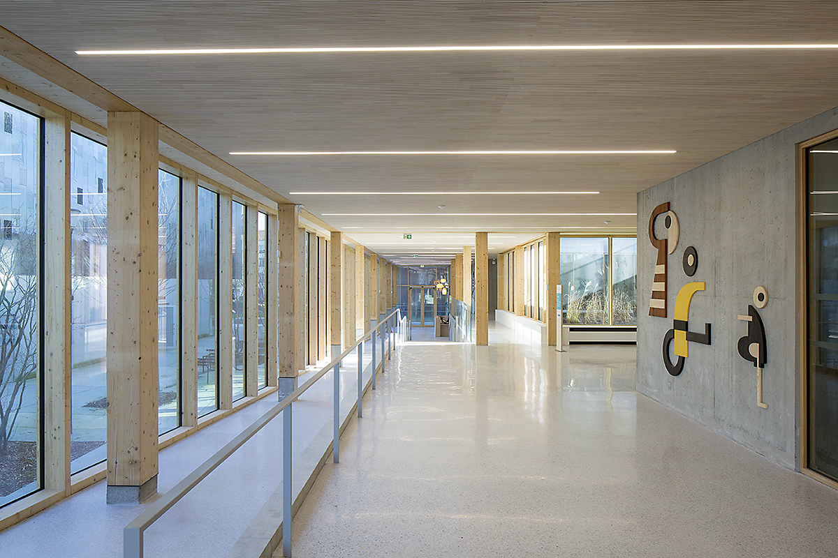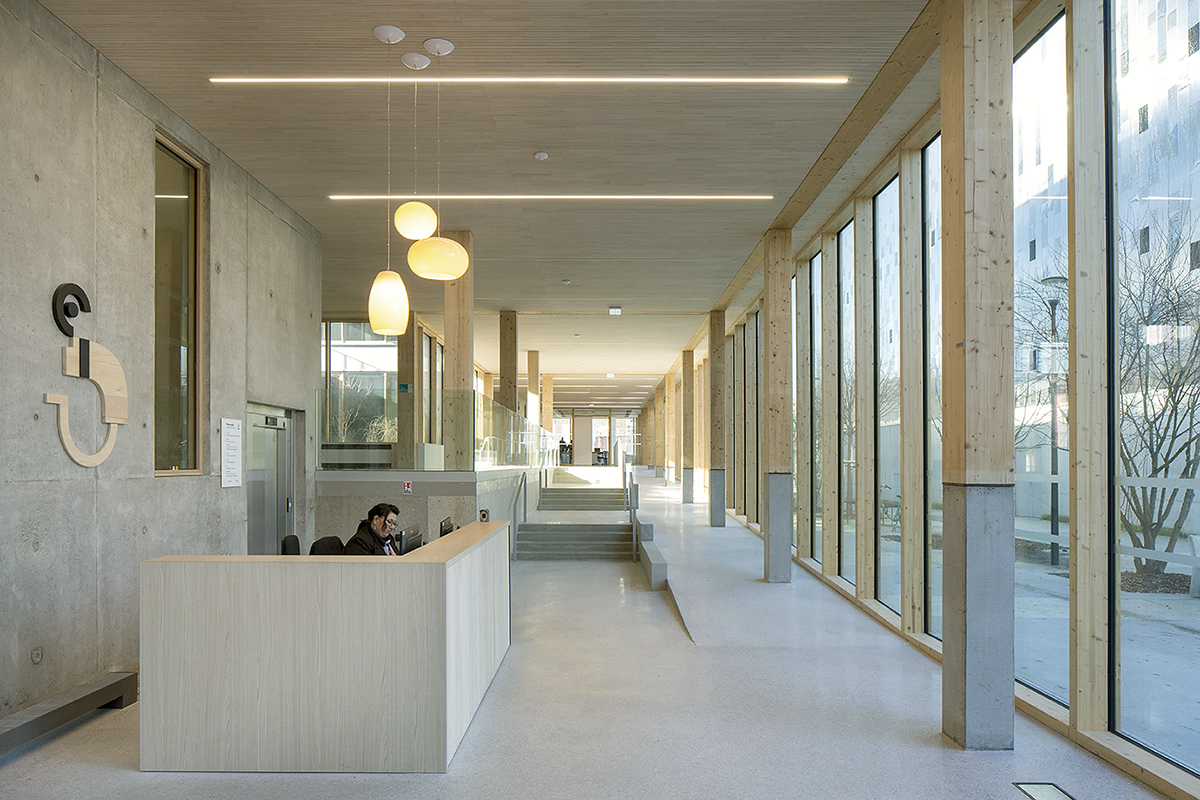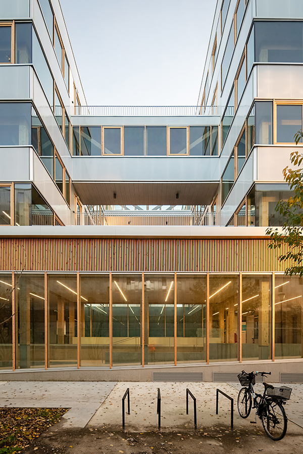 En réponse aux objectifs d’adaptabilité et d’évolutivité des usages ainsi qu’aux enjeux de développement durable, la conception structurelle du bâtiment prend le parti d’une structure bois de type poteaux/dalles bois de type CLT, contreventée par deux noyaux béton regroupant les circulations verticales et les locaux techniques et de service. Ce principe constructif permet de libérer chaque plateau de tout élément structurel, et offre ainsi une grande flexibilité d’usage et de modularité dans le temps. Le choix du bois accompagné de matériaux biosourcés constitue, pour la mise en œuvre de ce bâtiment, le gage de cette vision d’avenir et d’un impact réduit de la construction sur notre environnement, en nous permettant d’atteindre le niveau Bâtiment biosourcé 3. De même, la gestion des différentes orientations du bâtiment se fait par une conception intelligente de façades en alternance d’allèges pleines et de bandeaux vitrés qui intègrent la mise en place de protections solaires adaptées aux différents cas de surchauffe.