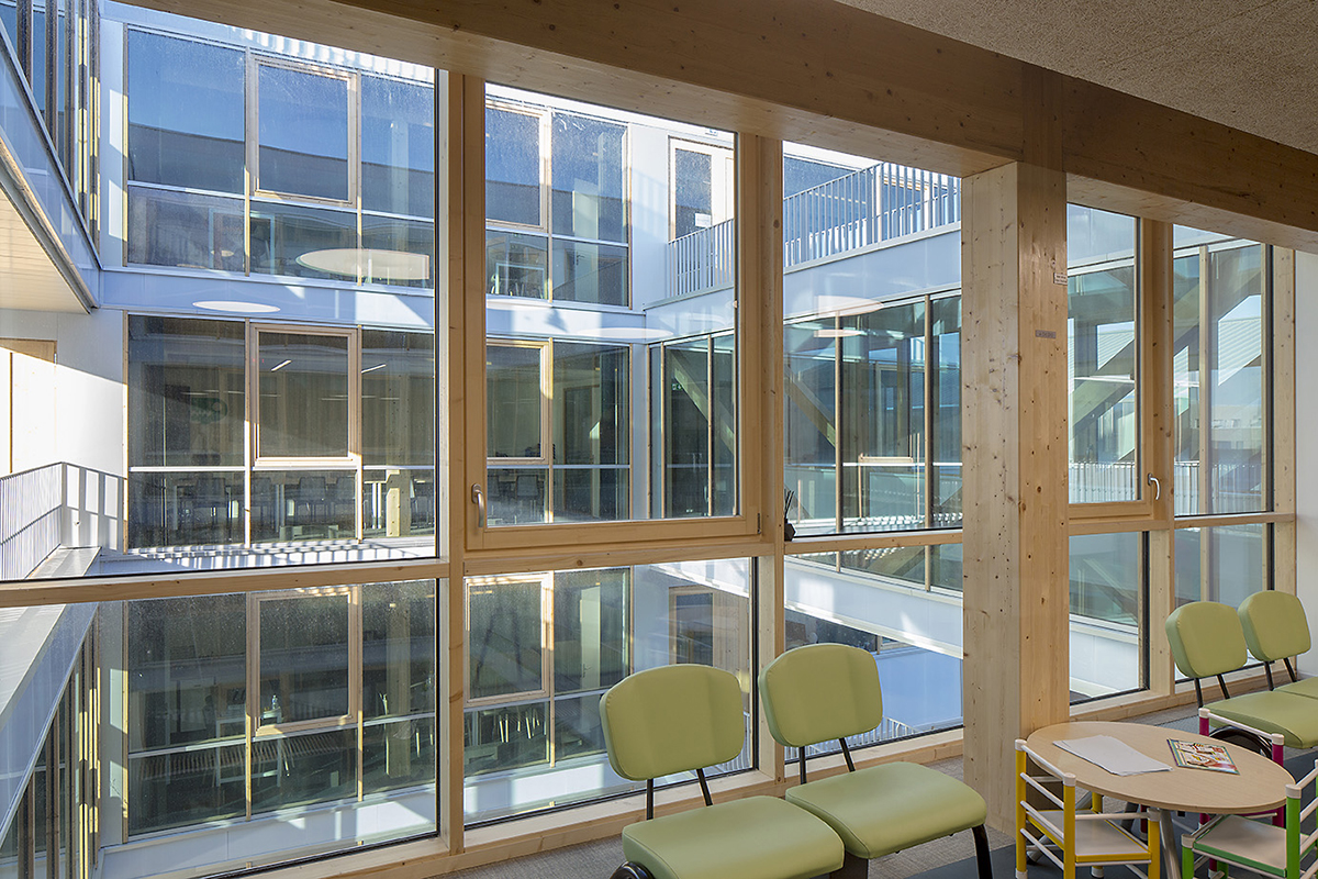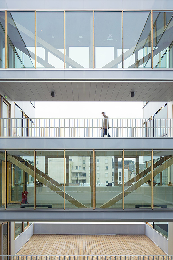 Depuis le jardin public et du parvis de l’espace Simone Veil, l’accroche du bâtiment se fait par le biais du hall et des espaces d’accueil conçus de façon vaste, généreuse et lumineuse. Parfaitement lisibles depuis l’extérieur, ils confèrent ainsi l’image d’un service public ouvert à tous. Longeant la rue Bonnivet, la façade haute du rez-de-chaussée largement vitrée vient en contrepoint d’une position relativement enclavée de la parcelle et accompagne le piéton jusqu’à l’entrée. Cette plateforme est surplombée de deux plots distincts qui répondent aux enjeux des prescriptions architecturales et urbaines du quartier, et permettent des percées visuelles vers le jardin depuis les logements de la rue Masséna. Ils dégagent un espace central appelé le patio. Les façades de ces volumes habillés de matériaux clairs et lumineux ponctués par la structure et les menuiseries bois sont conçues pour offrir une perception changeante tout au long de la journée et engager ainsi un dialogue clair et doux avec le volume du complexe sportif qui lui fait face.